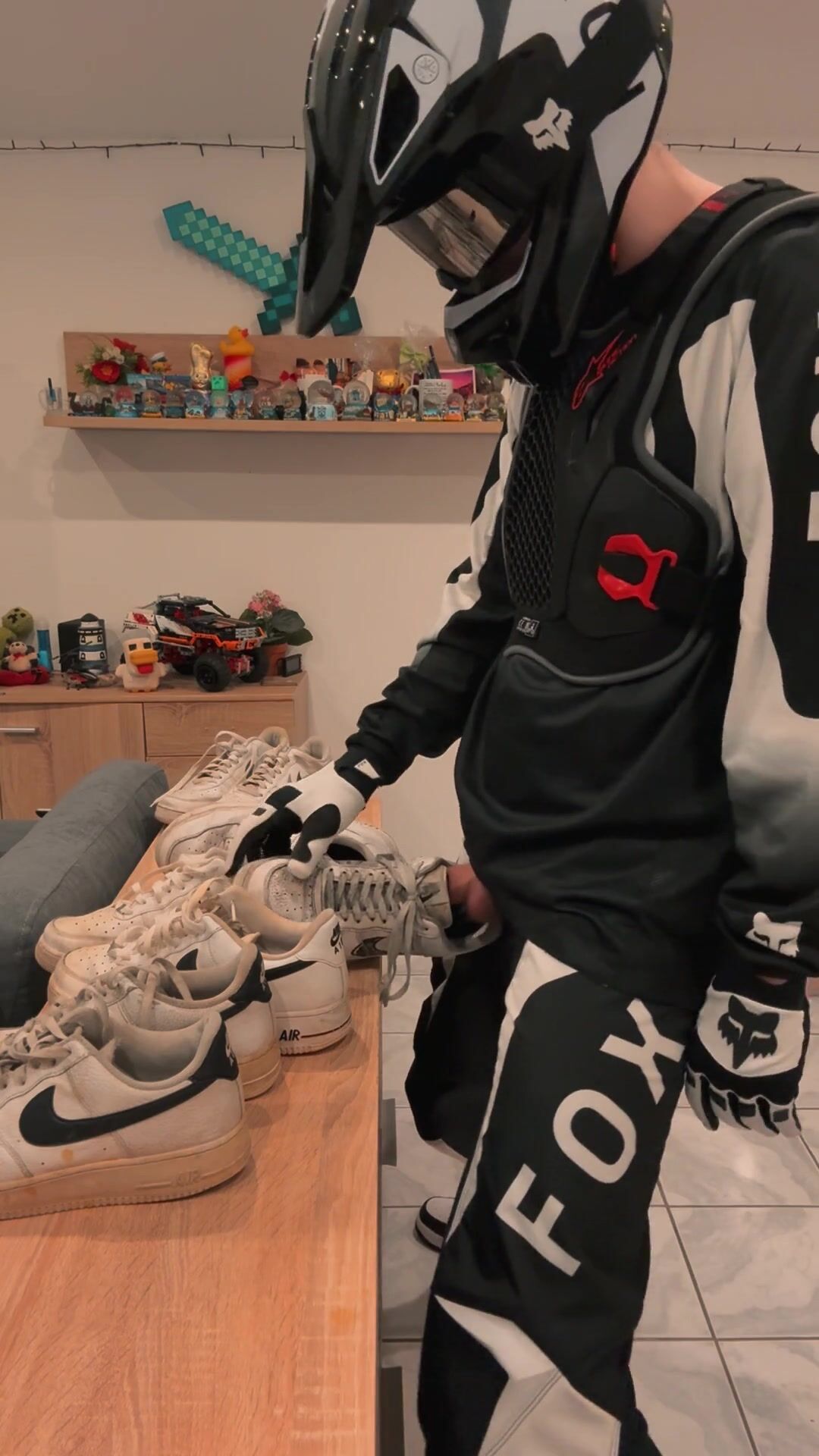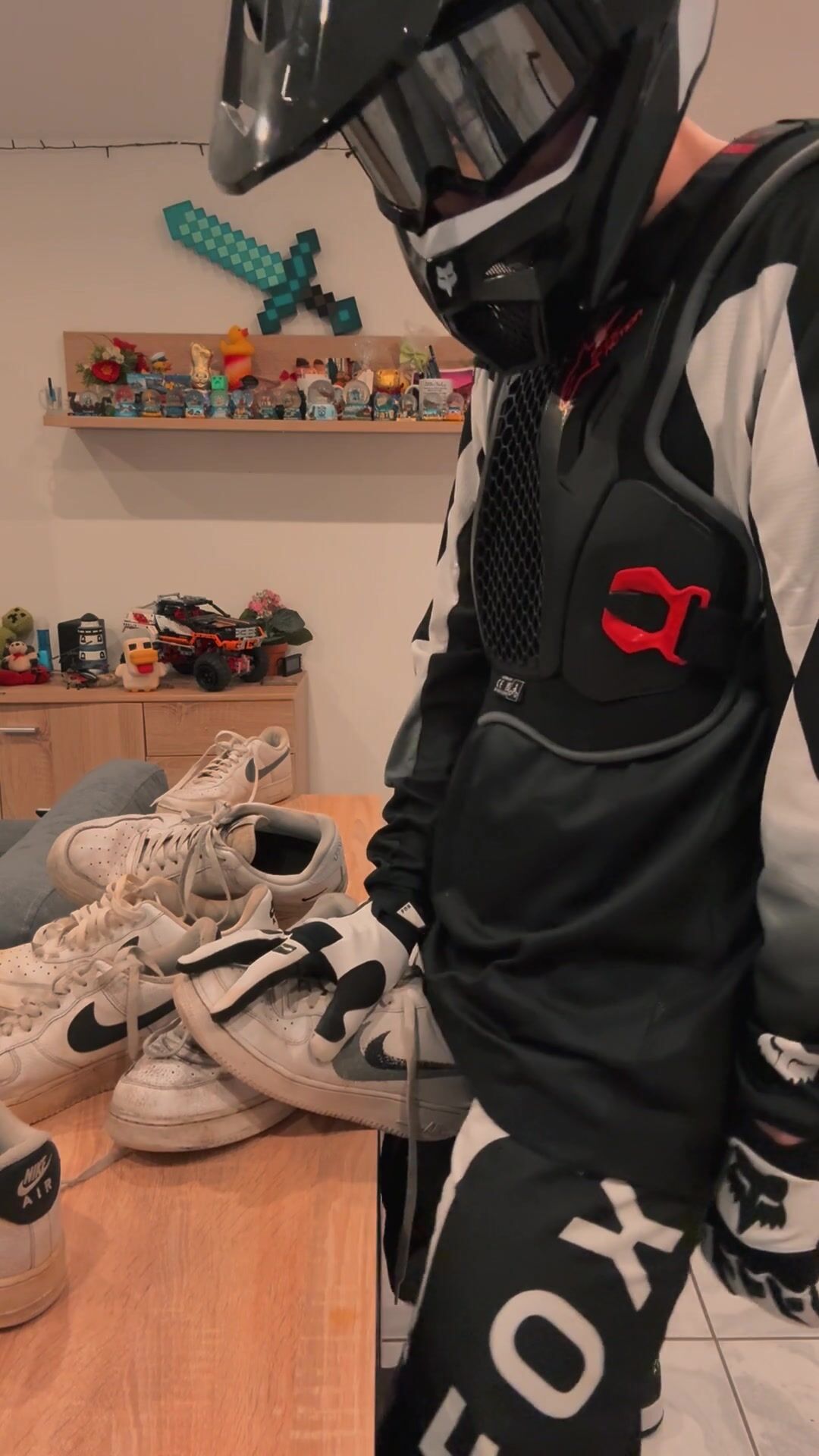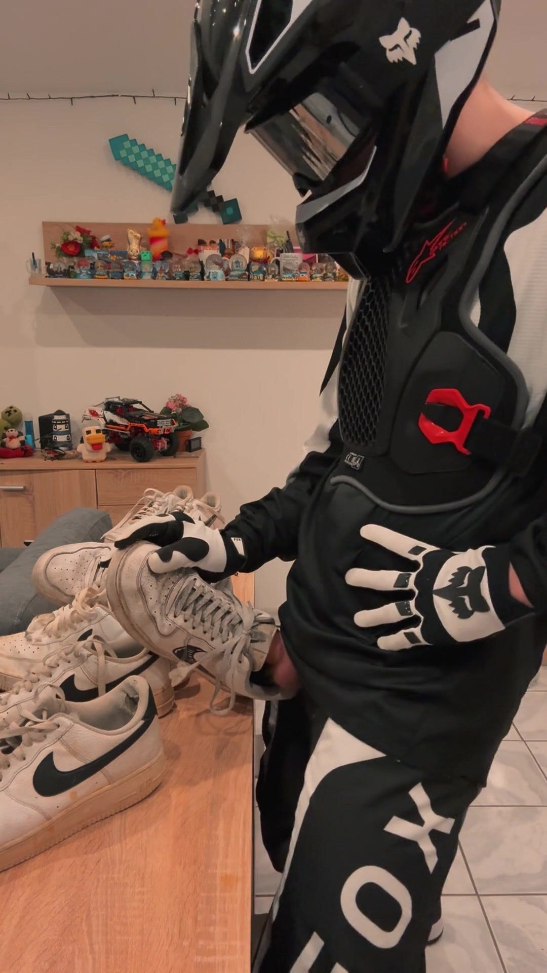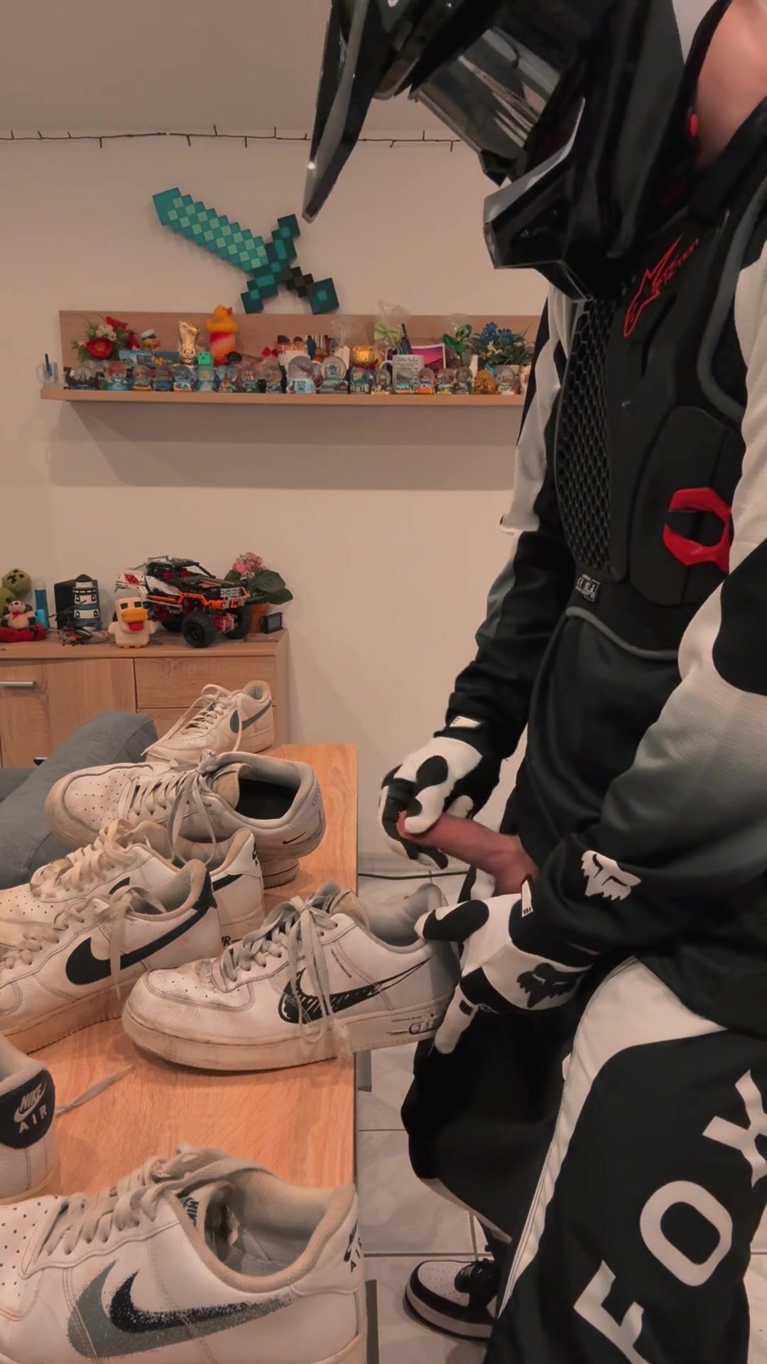 Mx Guy shoves his spear into the sneakers and crams them.