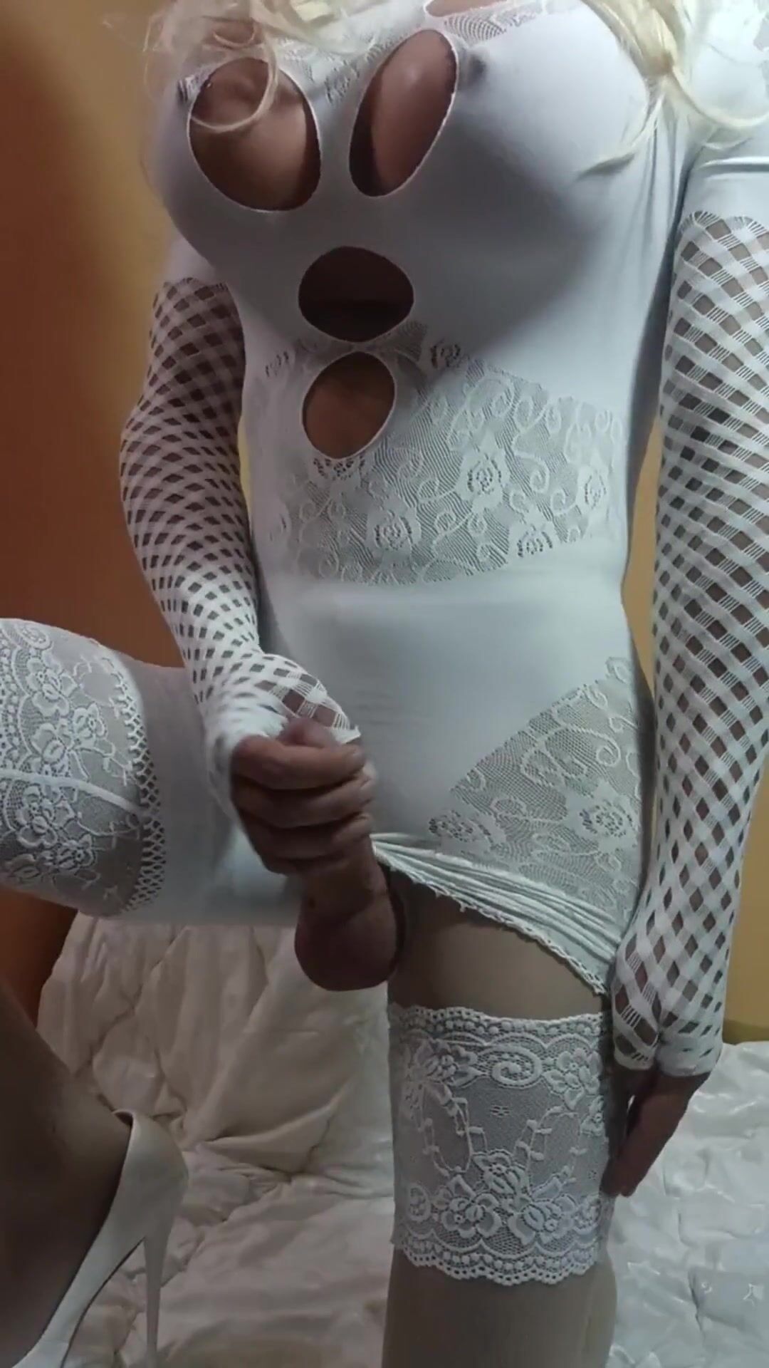 Bony crossdresser in milky assets toying with yam-sized beefstick