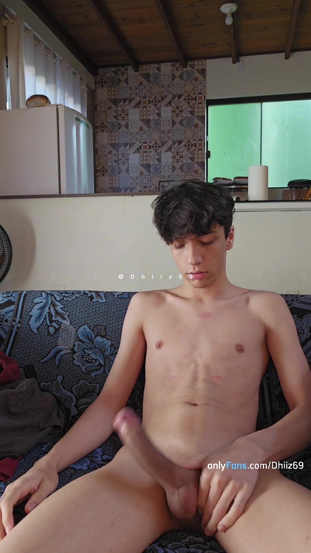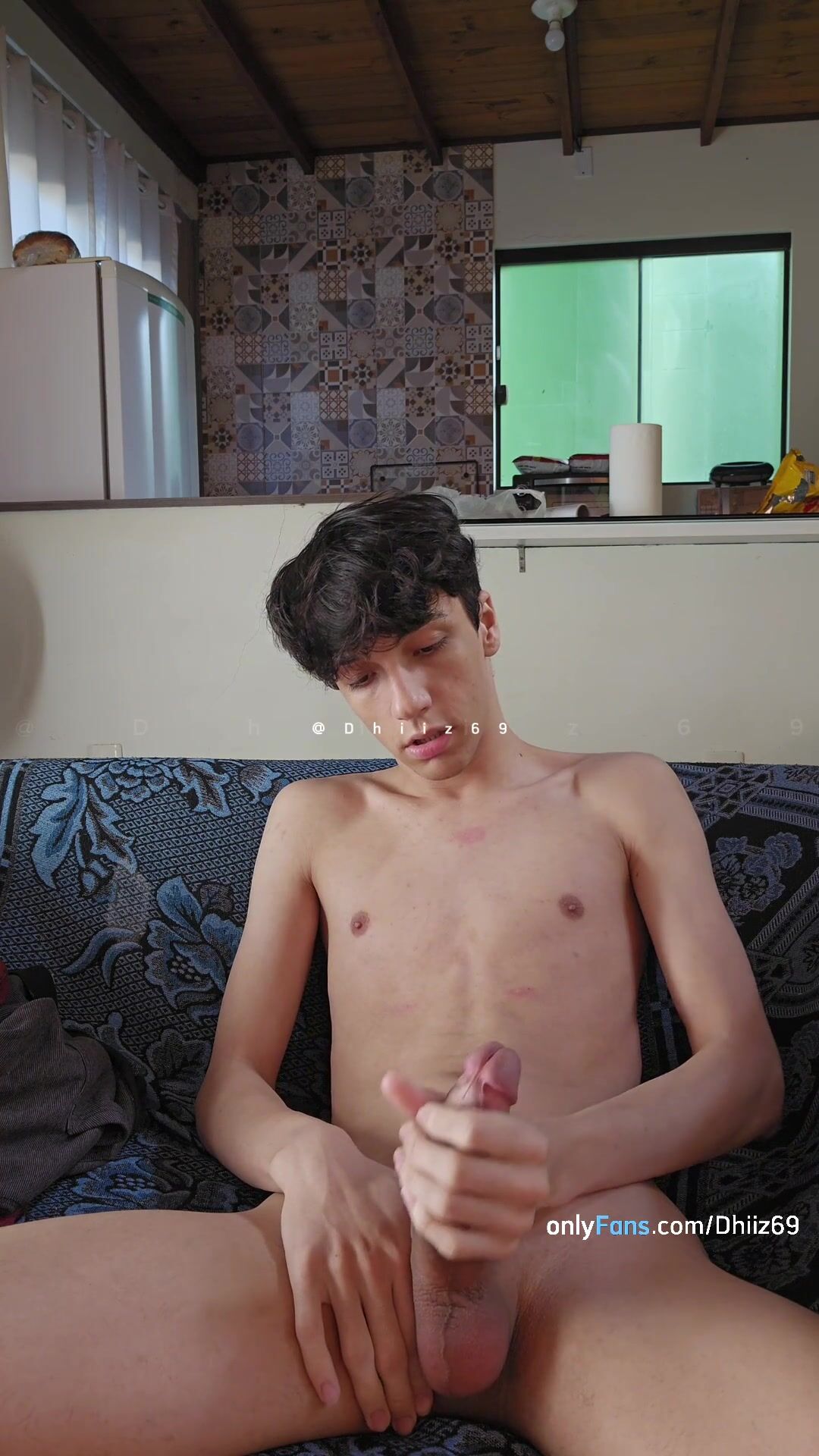 Man showcasing off his phat beef whistle and providing lots of jizz