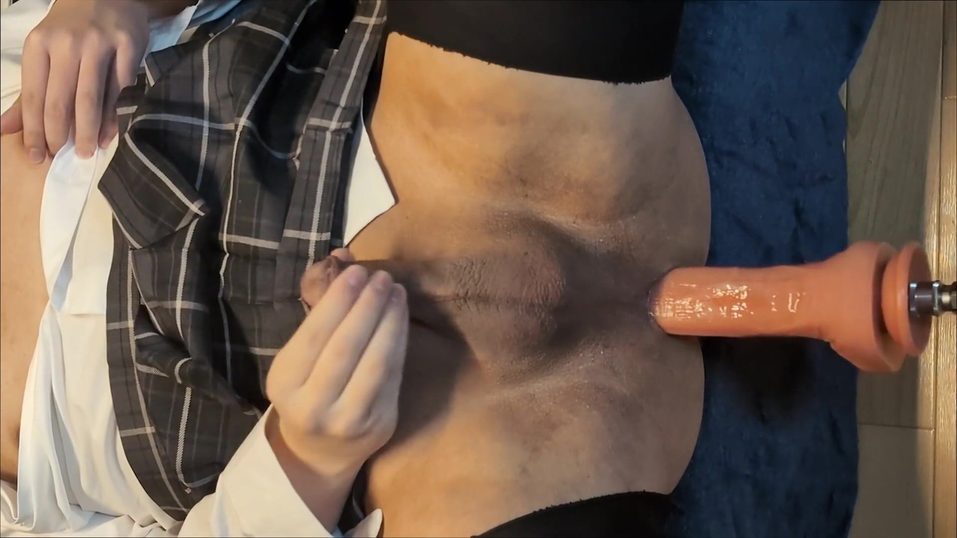 Chinese crossdresser uniform faux-cock and nip climaxes and blows a load numerous times