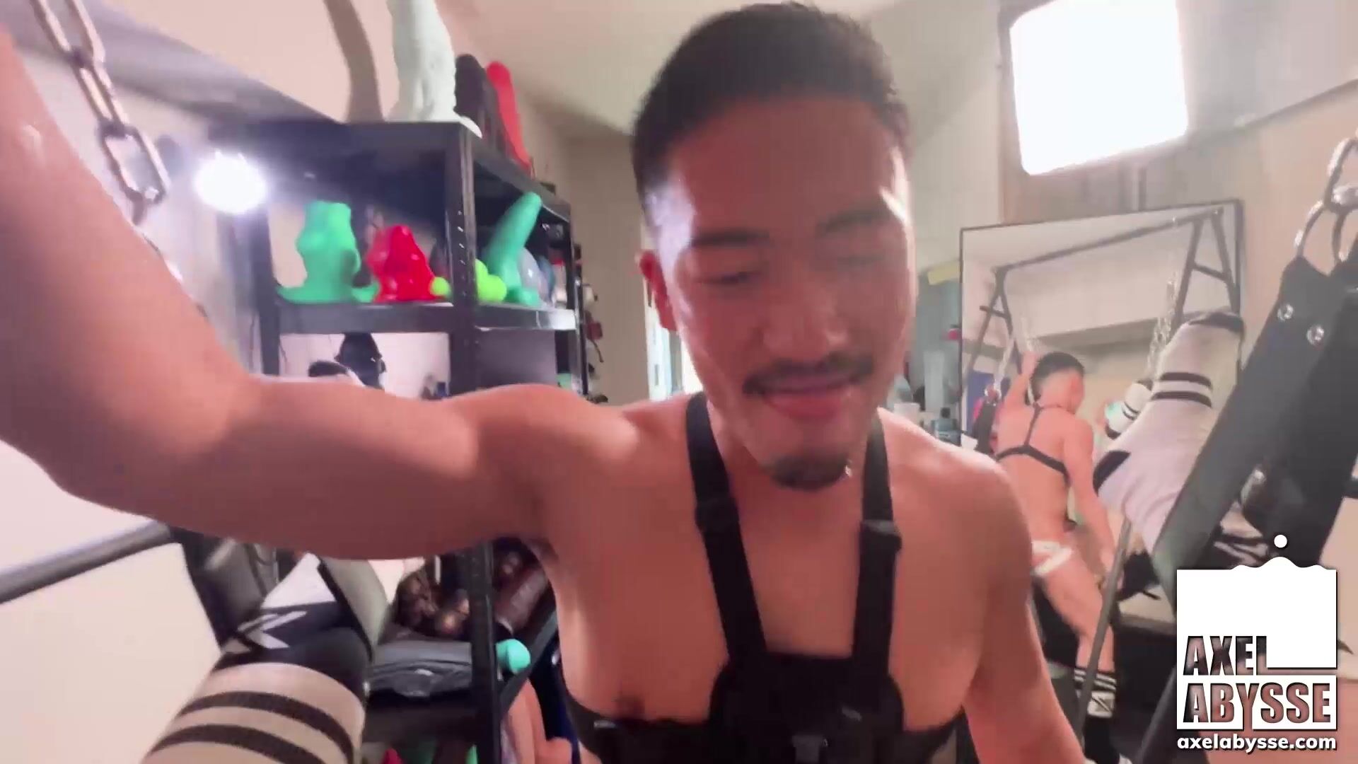 Axel in dirty tanktop and jockstrap, relaxes in his new sling, offering his hole for Tezro to fuck and punch relentlessly, dripping with precum.