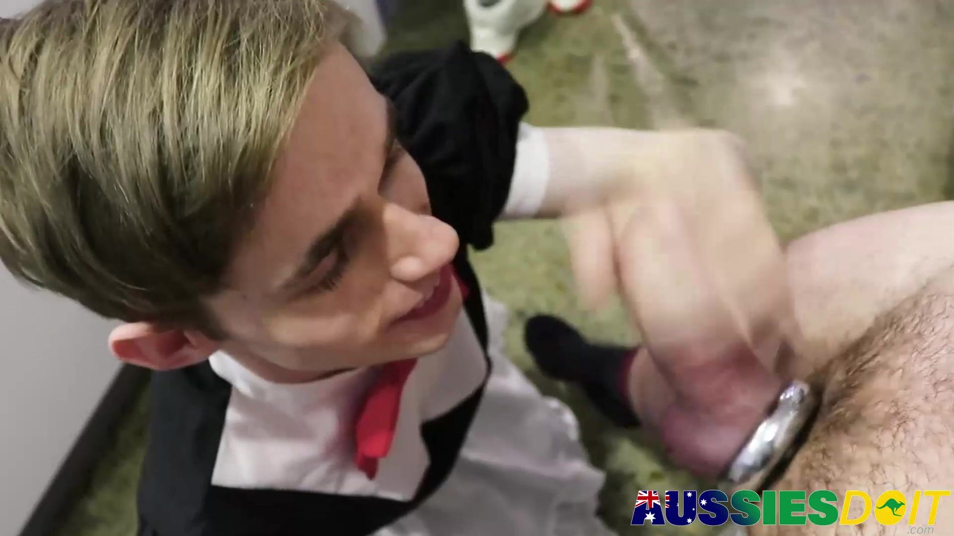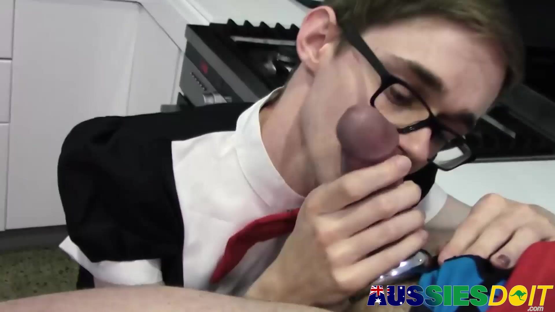 Jaxon gets his hands on the twink, fondling his cock as they make out in the kitchen. He gets up and gives Kaala a mouthful of his mature meat.