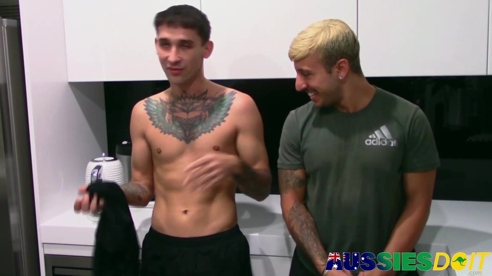Kandy and his friend engage in a playful physical activity, kissing, rubbing their bodies, and executing a deep drill on their tongue.
