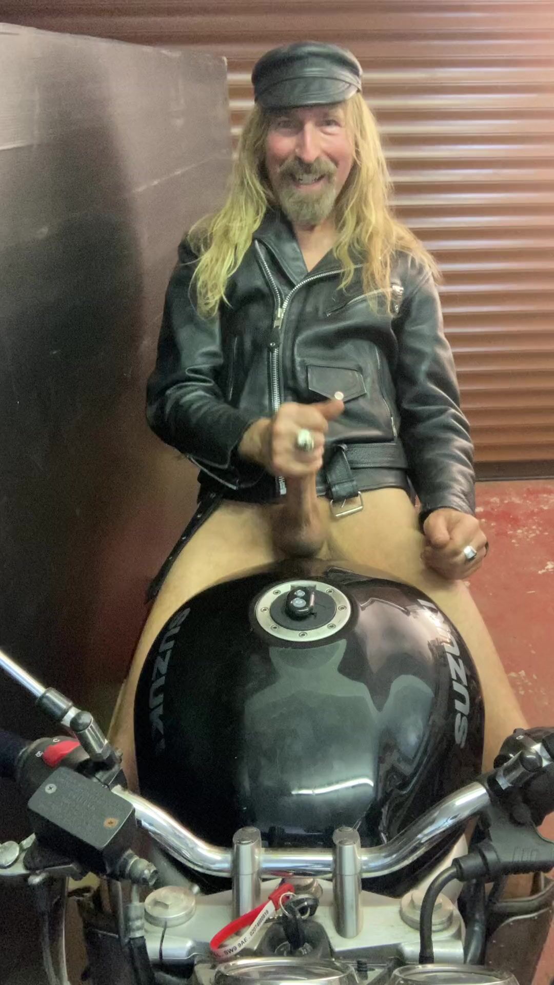 Longhairdude masturbating and shooting sitting astride Motorcycle in leather jacket, motocross footwear, hat