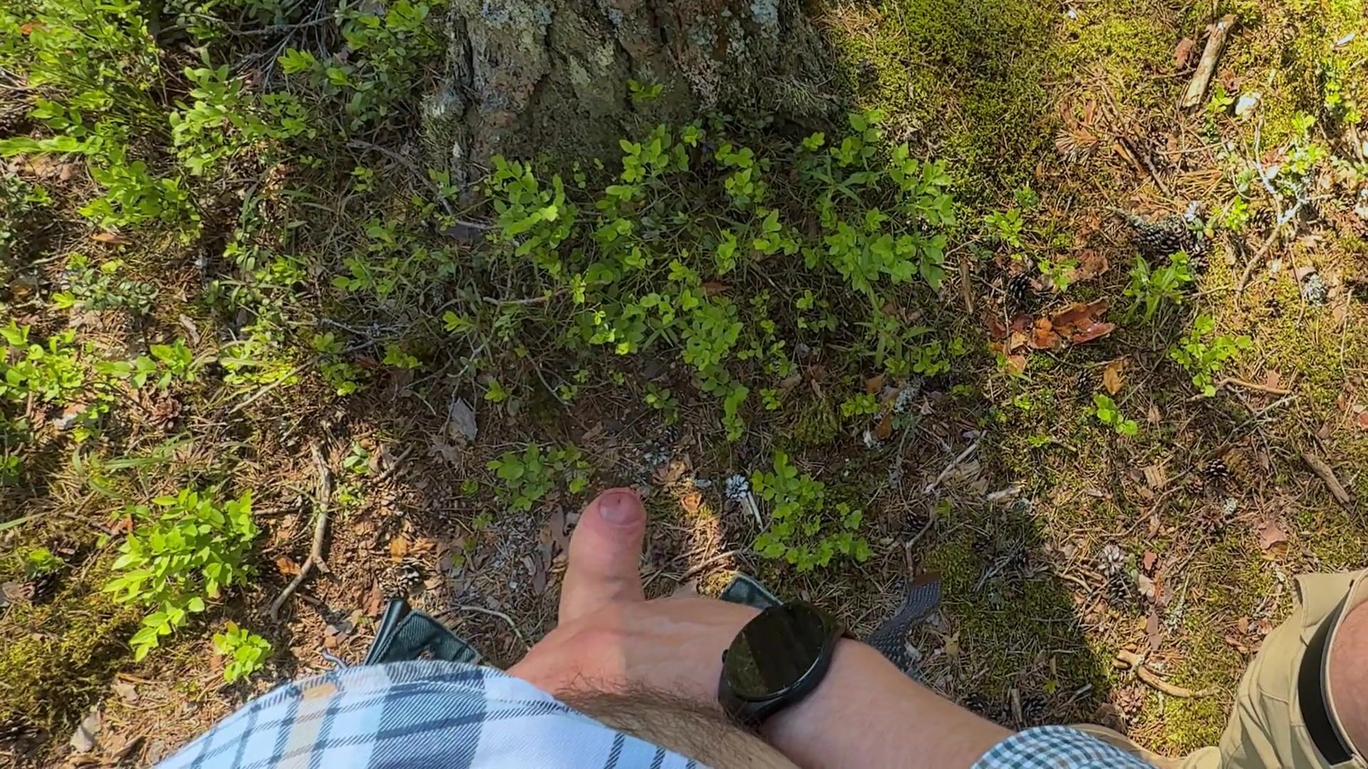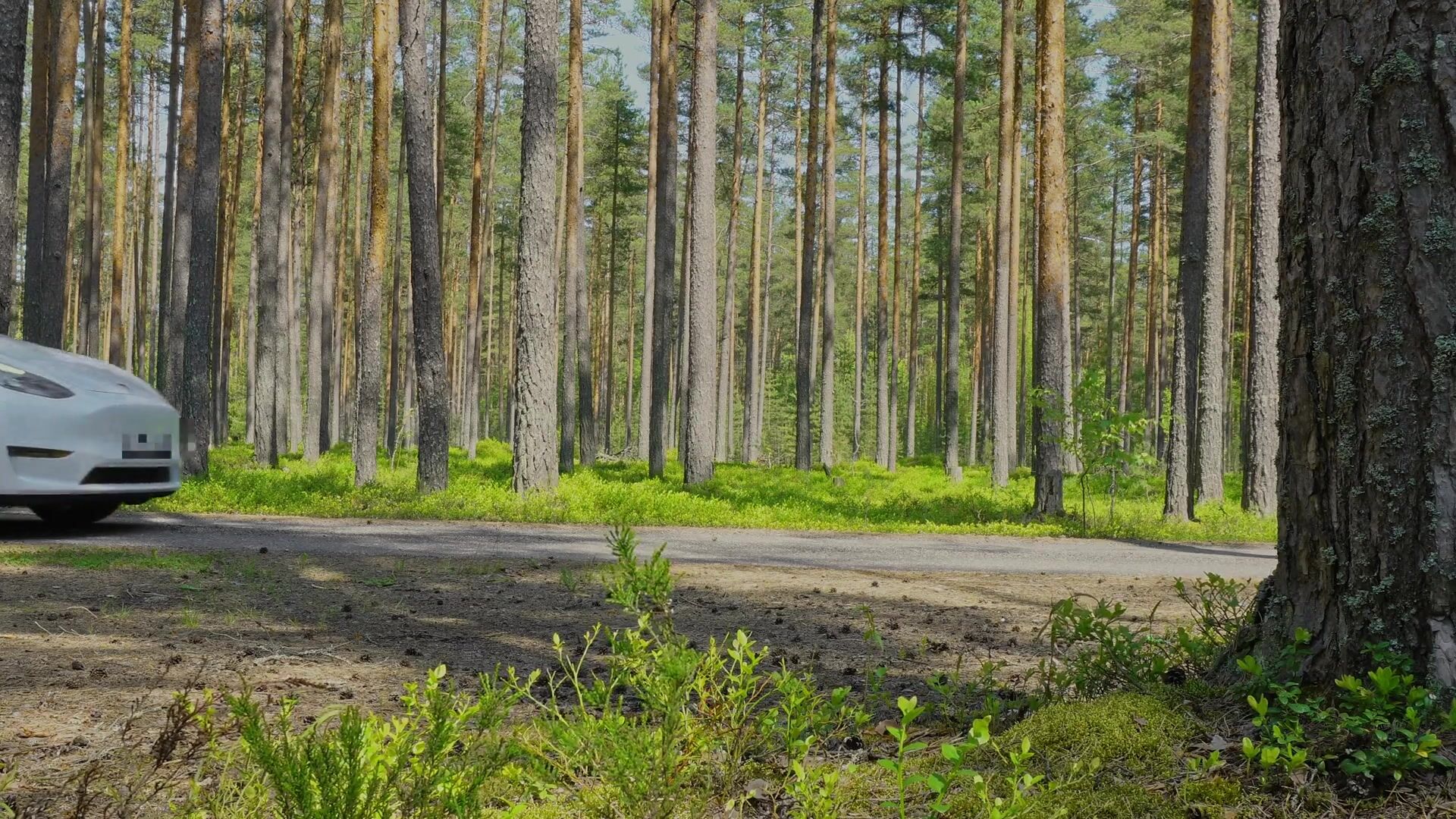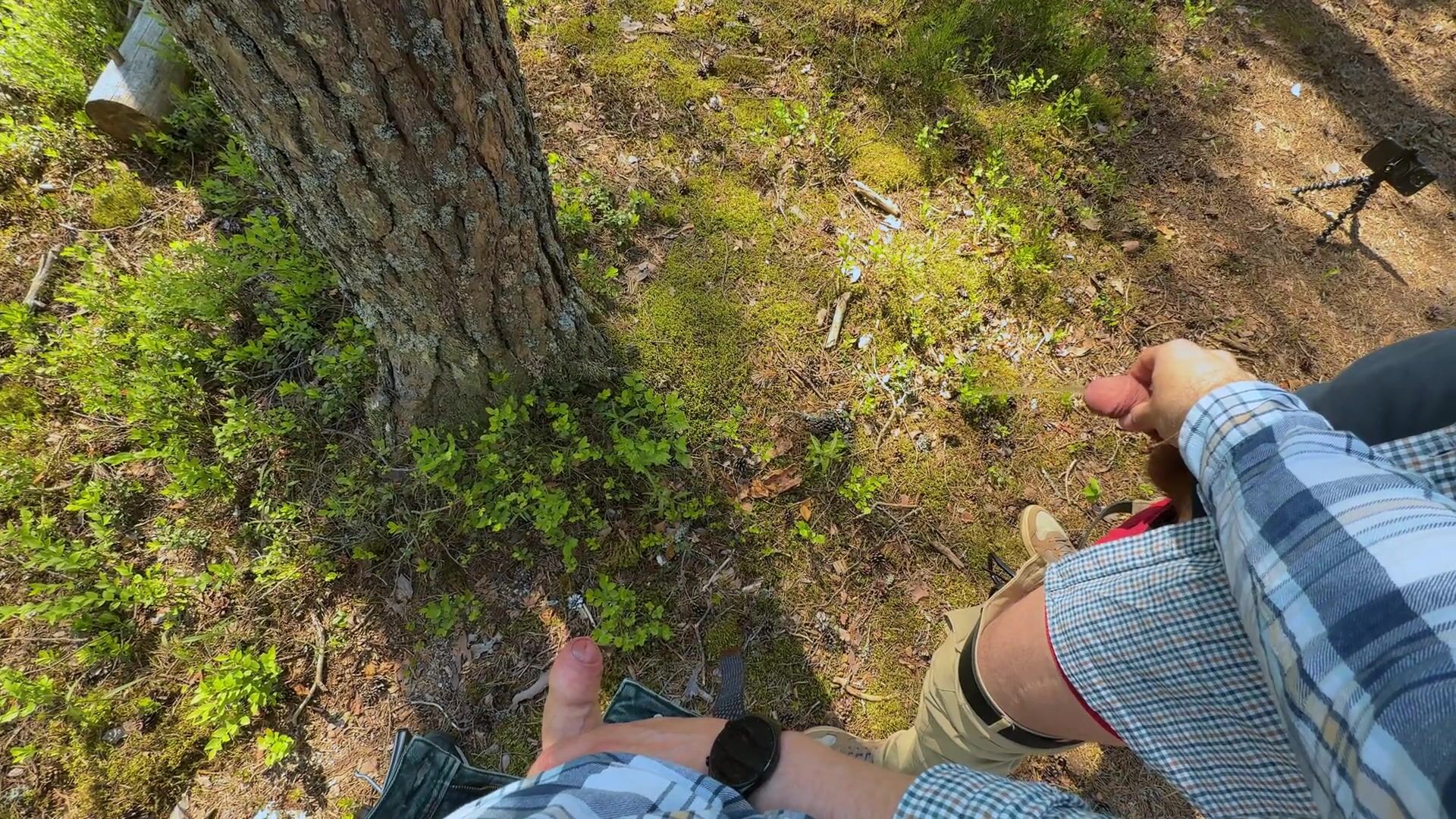 Furry fellow and his uncircumcised acquaintance piss on the side of road in forest next to Tesla truck. Outdoor peeing