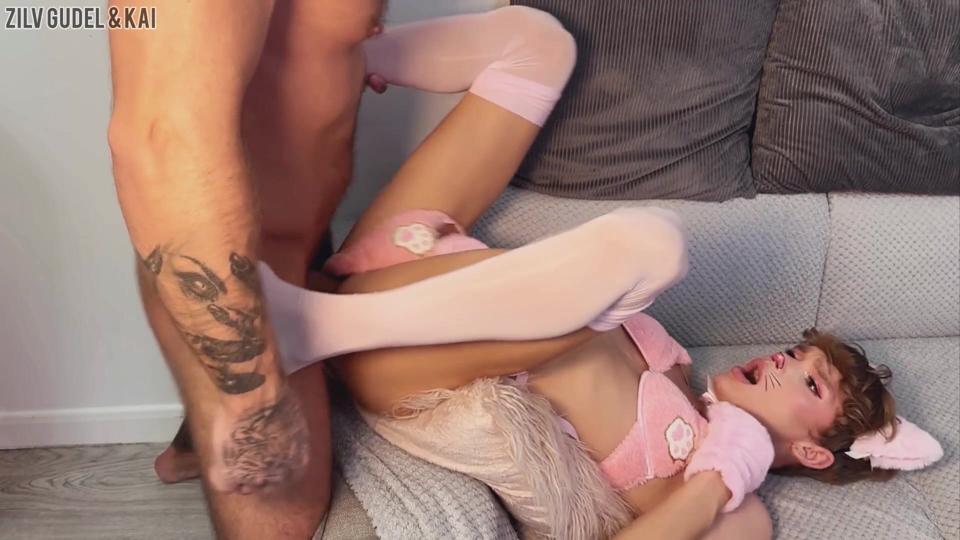 Pussycat Femboy gets his Slick Slot Spread Open by a Nicely-shaped Inked Man