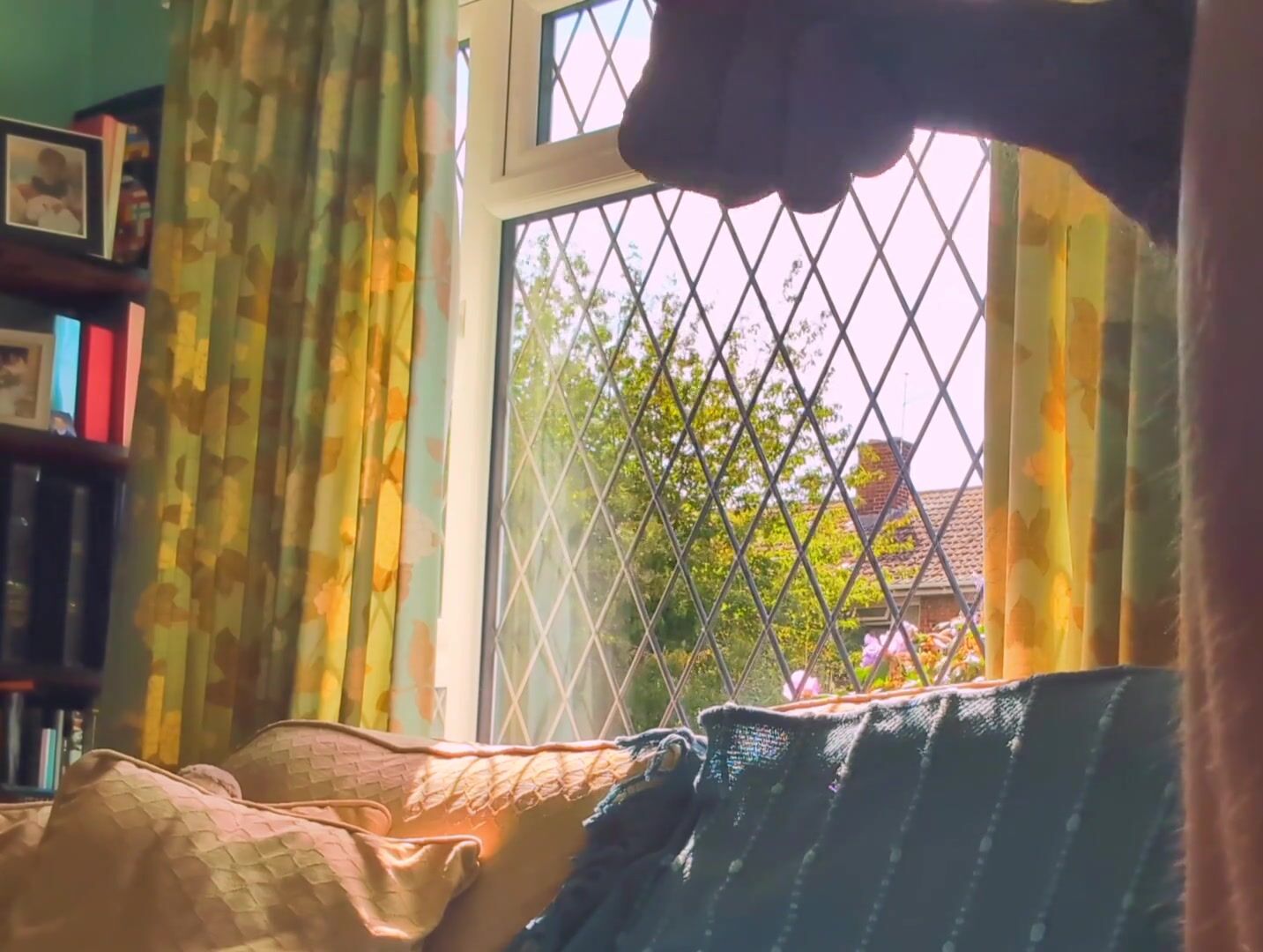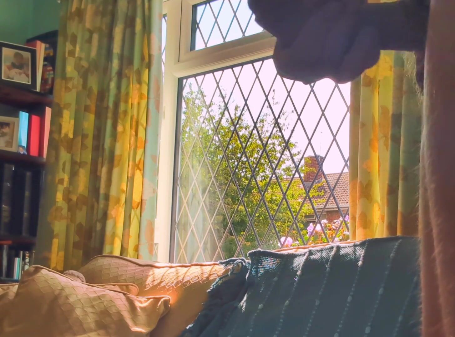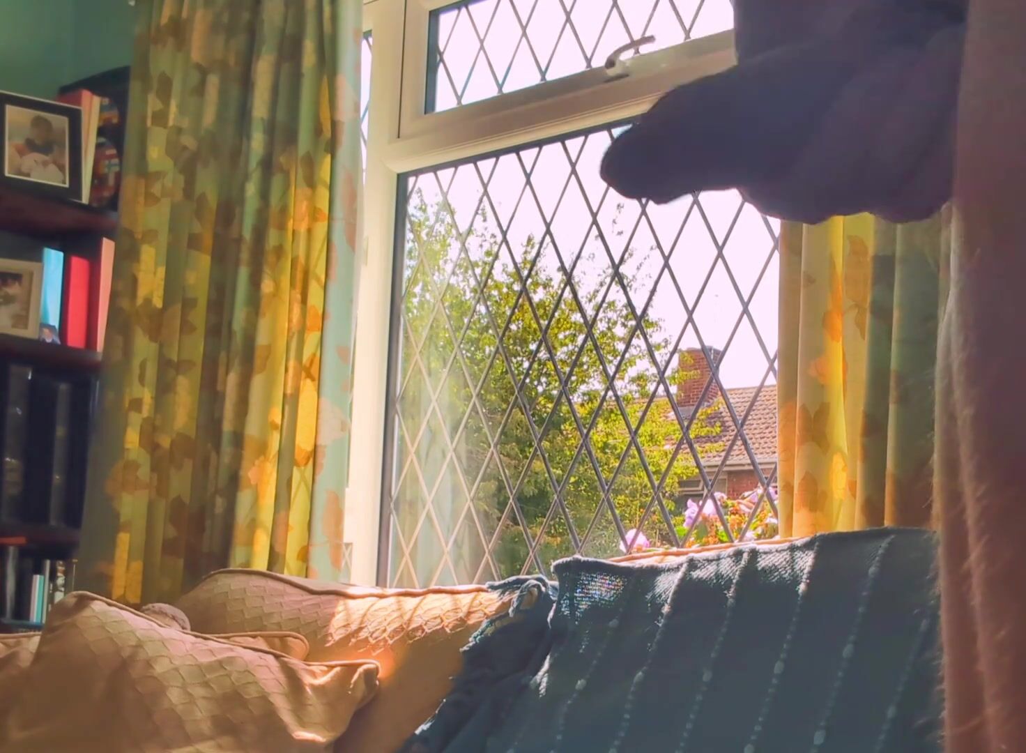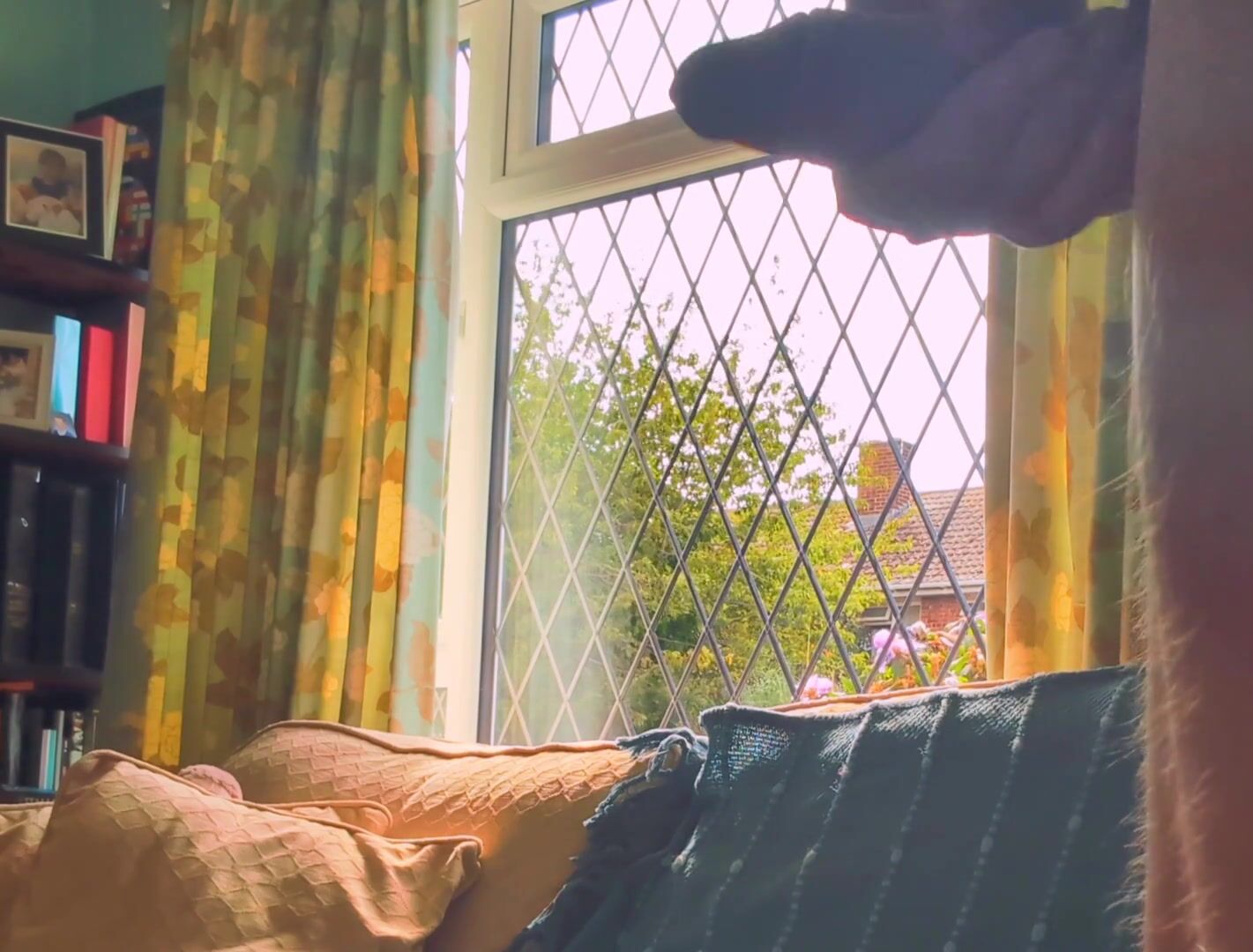 Having joy nude next to a window in utter glance with traffic passing by